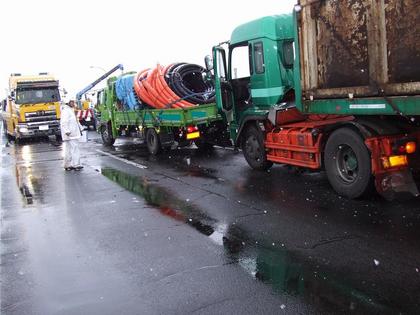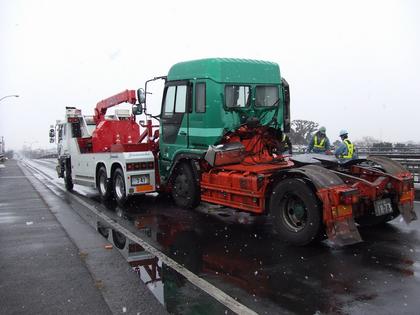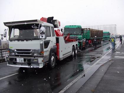 玉突き事故で大型レッカーが出動の要請があり出動しました。